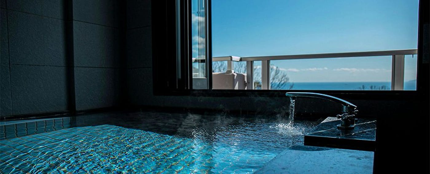露天風呂から伊豆大島が眺められるという、205号室のデラックスビューバスルームがいいな。