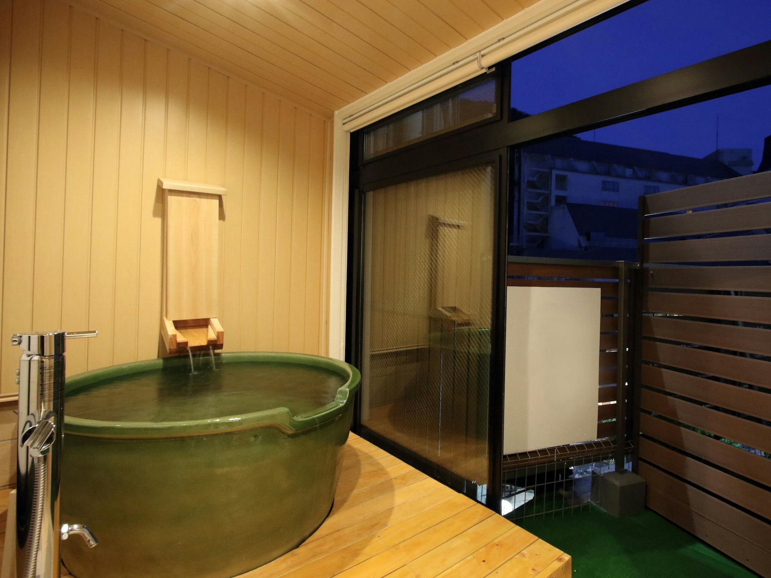 半露天風呂はゆったり湯船で贅沢なバスタイムを過ごせそうだ。