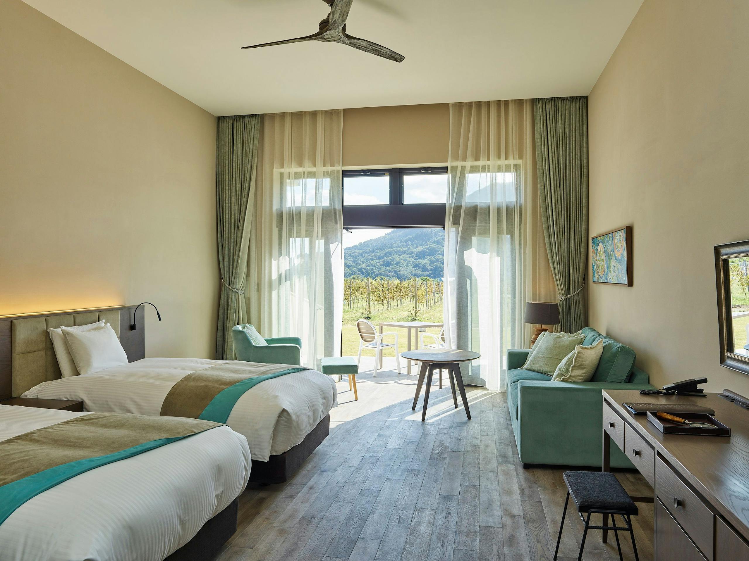 ブドウ畑に囲まれており、10室あるどの客室からも葡萄畑を眺められる。